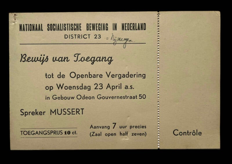 Bewijs van toegang spreker Mussert NSB district 23 Nijmegen