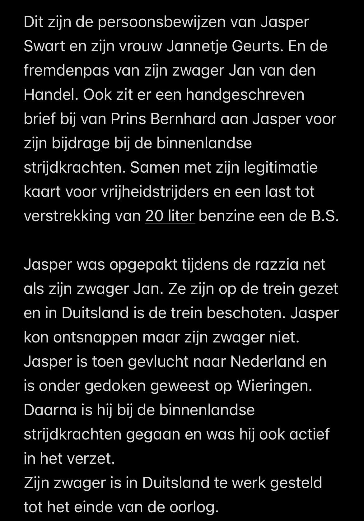 Het verhaal van Antoon Roeleven Koninginnenlaan 2 begint op een decemberavond in 1940, toen hij werd uitgenodigd voor een verzetsvergadering in een Nijmeegse pastorie. Wat er die avond werd besproken, doet er nu niet meer toe, maat toen de heer Roeleven weer op straat stond, was hij zo gespannen als een veer. Hij kende één ideaal: de Duitsers en hun trawanten bevechten tot het uiterste. Roeleven heeft woord gehouden, want als gevolg van een ziekte die hij zestien jaar geleden opliep door het verzet, is hij enkele weken geleden door de dokters opgegeven. Na de samenkomst in de pastorie verzekerde Antoon Roeleven zich van de medewerking van enkele vrienden en samen begonnen zij het gevaarlijke werk: piloten smokkelen, onderduikers onderbrengen en overvallen plegen. Tot de belangrijkste taak van Roeleven en zijn makkers behoorde het smokkelen van geallieerde piloten over de Waalbrug naar een opvangcentrum in de omgeving van Overasselt. Zij hadden gemene zaak gemaakt met een paar Oostenrijkse schildwachten van de brug en deze samenwerking verliep zo voortreffelijk, dat de illegale strijders zonder de achterdocht van de Duitsers op te wekken honderden piloten in veiligheid konden brengen. Alles ging goed tot in maart 1944. Op een koude maartnacht in dat jaar sloop Roeleven met twee Australische piloten door de weilanden rond Nijmegen naar Overasselt. Zij hadden pech. Het groepje mannen werd opgemerkt door enkele patrouillerende Duitsers. Roeleven reageerde zó snel, dat de vijanden niet direct konden toeslaan. Met de beide Australiërs achter zich aan sloop hij naar een riviertje en met een rietje als luchtbuis tussen hun lippen lieten de drie mannen zich op hun rug op de bodem van het water zakken. Meer dan een half uur lagen ze roerloos in het koude water. Hun lichamen werden hard en stijf als ijsblokken, maar de truc slaagde. De Duitsers waren om de tuin geleid en een half uur later, na zich eerst warm te hebben gewreven, waren de mannen al weer op weg naar het zuiden. Zonder mankeren leverde Roeleven zijn ,,vracht’’ af in Overasselt. Maar drie dagen na dit koude avontuur zakte Roeleven, die als bankwerker op een fabriek werkte, bewusteloos in elkaar. Hij werd naar huis gebracht, waar de dokter een zware pleuritis constateerde. ,,Voorlopig een half jaar naar bed,’’zei de geneesheer. Het gewicht van de kolossale verzetsstrijder verminderde in deze periode van 186 tot 102 pond. Roeleven was doodziek, maar vol belangstelling luisterde hij naar de boeiende belevenissen van zijn vrienden in het verzet. Op 17 september 1944. Vertelde één van hem, dat de eerste Amerikanen waren gesignaleerd aan de grens van de stad. Van dat ogenblik af was Roeleven niet meer te houden. Resoluut sloeg hij zijn dekens terug, kleedde zich met het koortszweet op zijn voorhoofd aan, greep zijn carabijn en ging met zijn makkers op zoek naar de Amerikanen. Bij de Graafse brug beleefde Antoon Roeleven één van de mooiste ogenblikken van zijn leven. Hij schudde, ofschoon hij bijna niet op zijn benen kon blijven staan, vol eerbied de hand van de eerste bevrijder, de voor de Nijmeegse verzetsstrijder legendarische Amerikaan, Ted Bachenheimer. Nijmegen was spoedig bevrijd. Roeleven trok met de Amerikanen en Canadezen naar het noorden en het oosten, vechtend als een leeuw, als een man zijn pijn verbijsterd. En het was een hele tegenvaller voor hem, toen hij door de Nederlandse legerleiding uit Duitsland werd teruggeroepen. Eenmaal terug, kreeg zijn leven een dramatische wending. Op zekere dag botste een dronken Canadees met zijn wagen in volle vaart tegen de auto van Roelen. De Nijmegenaar werd met een zware hersenschudding opgenomen in een ziekenhuis. Maar wat erger was, het lichaam van Roeleven was zo verzwakt, dat de nog niet genezen pleuritis alle gelegenheid kreeg, zijn vernietigende werk voort te zetten. Roeleven moest het hoofd buigen. Hij was oorlogsinvalide en lag jaren op bed. ,,dat was niet het ergste,’’ vertelde Roeleven nu. ,,De grootste klap kreeg ik, toen bleek dat ik geen recht had op een invaliditeitspensioen. Vijf jaar moest mijn vrouw met zeven kinderen rond komen met 25 gulden per week. Wij hebben schreeuwende armoede geleden.” Langzaam verbeterde de toestand van Roeleven, maar vier jaar geleden kreeg hij opnieuw een inzinking. Hij moest weer op bed. Zijn hart wilde niet meer. Angina pectoris, constateerde de dokters. De oorzaak was ook nu weer de sloot die hij zeventien jaar geleden moest opzoeken, om te ontkomen aan de wraak van de bezetters. De laatste jaren is Roeleven niet meer van zijn bed geweest. Per dag eet hij zes beschuiten, aangevuld met drie kopjes melk, voor de helft aangelengd met water. Al vier jaar lang. Roeleven is opgegeven door de dokters. Hij weet het. Hij krijgt doorlopend hartaanvallen, maar hij is er zo vertrouwd mee als met zijn hoofdkussen. Flak na de oorlog zei Prins Bernhard eens tegen hem: ,, als we meer kerels van jouw soort hadden, Roeleven, dan zouden we het in Nederland heel wat verder hebben gebracht! “ dat zei de Prins en het doet de zieke borst van Roeleven nog altijd zwellen van trots. Het is één van zijn herinneringen aan een groots verleden.